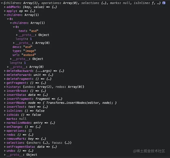 通过截图,我们可以知道editor提供children去存储我们的Node节点,同时提供了很多全局的方法供我们去使用,例如 insertNodes 插入节点
