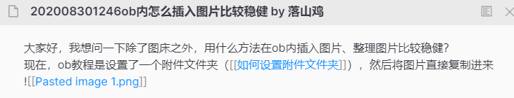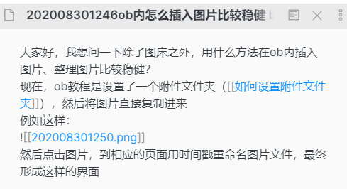 大家好,我想问一下除了图床之外,用什么方法在ob内插入图片、整理图片比较稳健? 现在,ob教程是设置了一个附件文件夹(如何设置附件文件夹),然后将图片直接复制进来 例如这样: 然后点击图片,到相应的页面用时间戳重命名图片文件,最终形成这样的界面:
