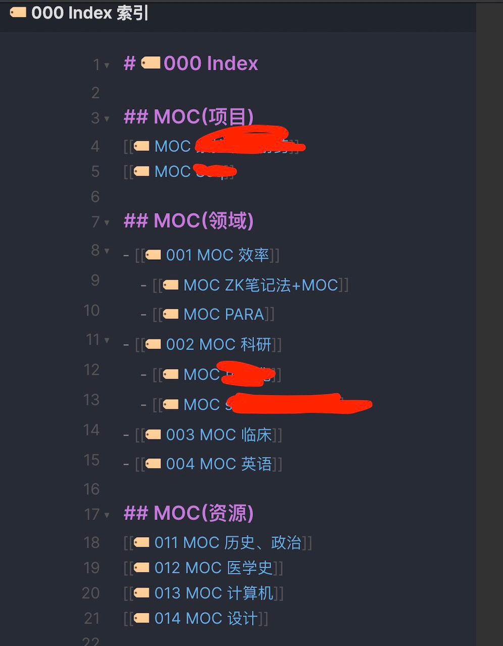 我所有东西都放一个文件夹了,新建的也是。然后想写啥先写,完了后创造一个相近的上一层的概括主题链接,比如,卢曼风险社会学书籍笔记,就可以链接“风险社会”,如果风险社会我之前没链接再上一层,我会,在风险社会页面里面链接,一个大的,[[01 MOC 研究领域]],然后放到我的索引页里面。所以现在都是自下而上的分类,其实也没分类的麻烦,就建立两个左右导航主题,最后归档到索引页,方便我以后唤醒。